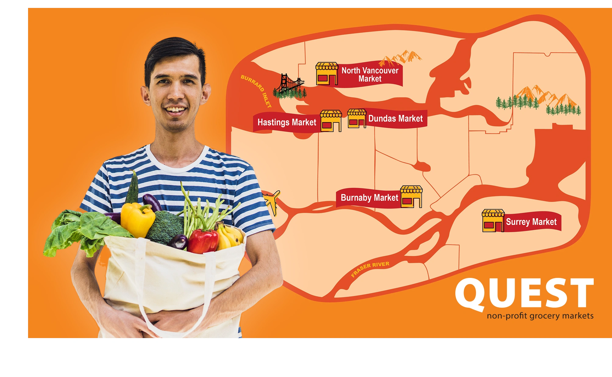 Quest Non-Profit Grocery Markets is dedicated to breaking the cycle of food insecurity by providing access to healthy and affordable food that is sourced sustainably. By bridging the gap between food banks and traditional grocery stores, Quest offers a grocery experience rooted in dignity, accessibility and sustainability. The majority of Quest’s food is donated by local food partners from across British Columbia and distributed across their five markets in Metro Vancouver.